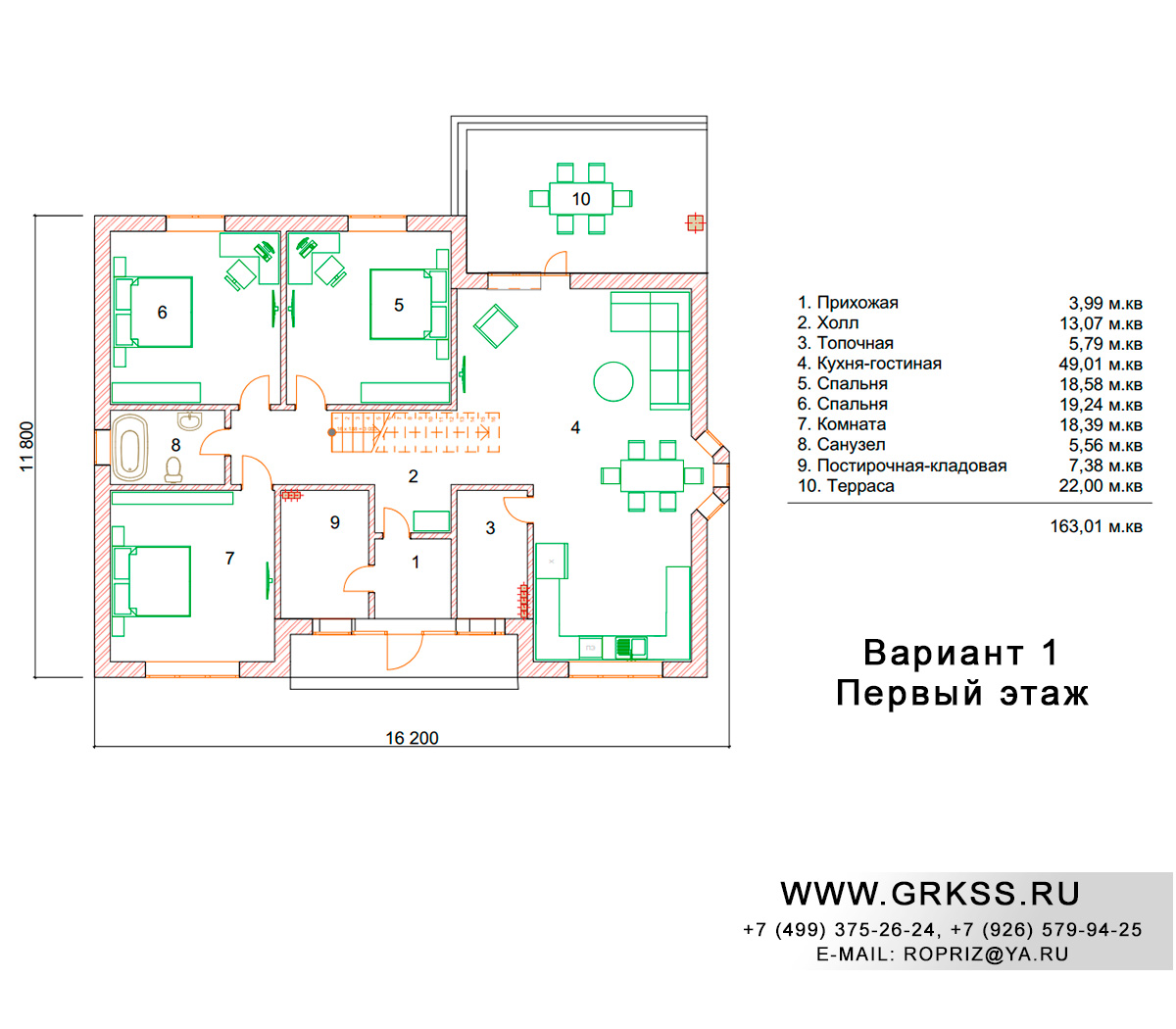 Проект "полуторно-этажного" дома с условным названием "Элегия". На первый взгляд, рассматриваемый проект дома может показаться одноэтажным, но на самом деле под не маленькой крышей данного дома расположена мансарда. Под крышей которой спряталось свободное помещение размером сопоставимым с площадью двухкомнатной квартиры. Обустроить данное пространство можно по разному, но в любом случае, 63 квадратных метра мансарды удовлетворят потребности любого дизайнера, в самых смелых его проектах. Нельзя не отметить и внушительную площадь первого этажа, не много ни мало а это 100 метров квадратных, в которые вписано три спальных комнаты и внушительного размера кухня-гостиная, занимающая почти половину площади первого этажа, настоящего проекта.
