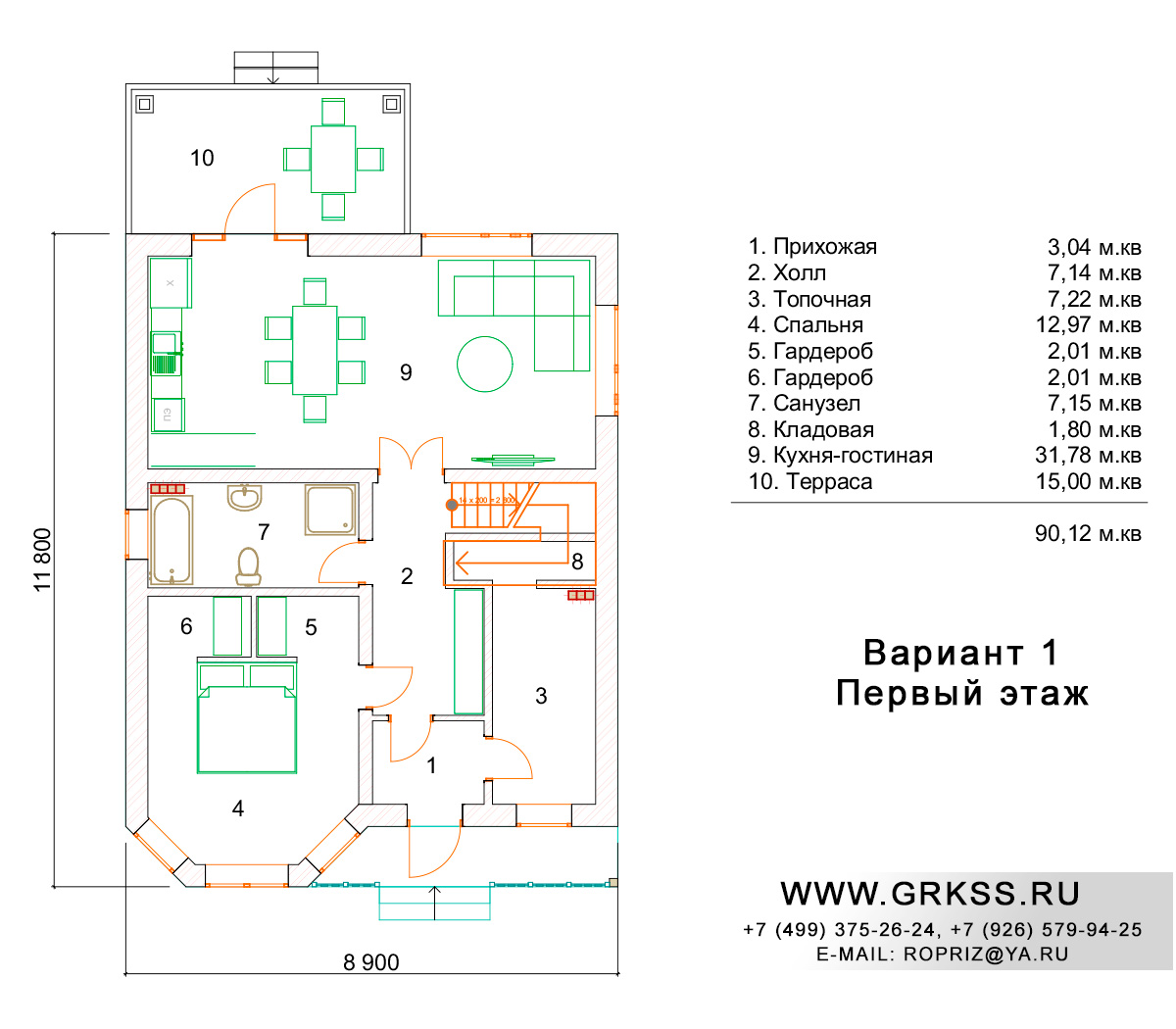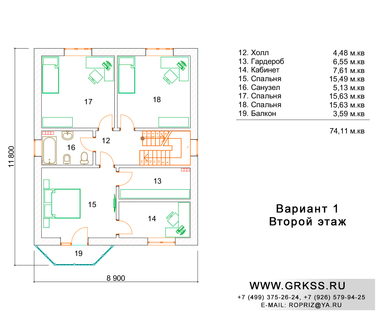 Проект полуторноэтажного дома с условным названием "Хибина". Проект представленного дома имеет интересную планировку, кухня и столовая в данном проекте объединены общим пространством, при этом проект предусматривает возможность устройства террасы. Для придания интересного внешнего вида, фасад дома выделен эркером, который своим наличием образует балкон с возможностью выхода на него из спальни второго этажа. При относительно небольших размерах, длинна стен проекта всего 11,8 и 8,9 метров соответственно, проект вместил в себя четыре спальни и кабинет, более того проектом предусмотрено наличие трех небольших помещений с возможностью их использования для хранения различного рода вещей и предметов. Дом данных размеров прекрасно впишется в зону небольшого дачного участка а так же подойдет для круглогодичного проживания.