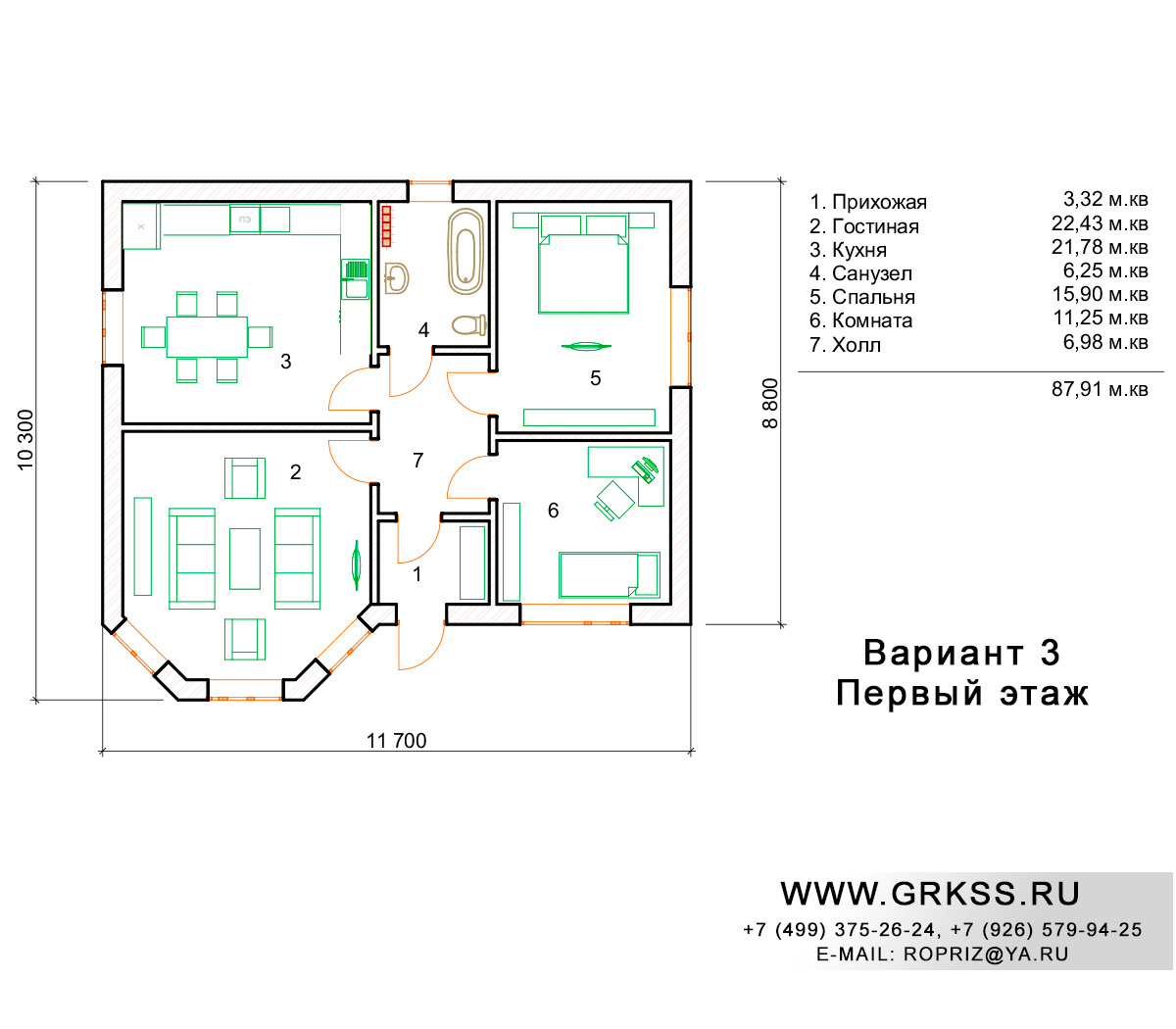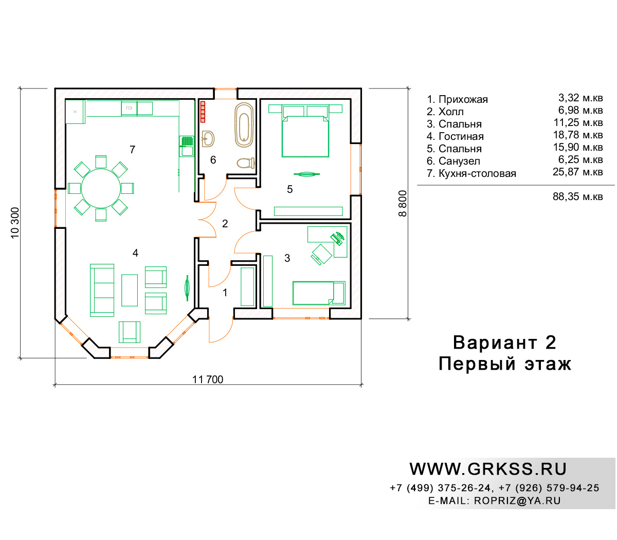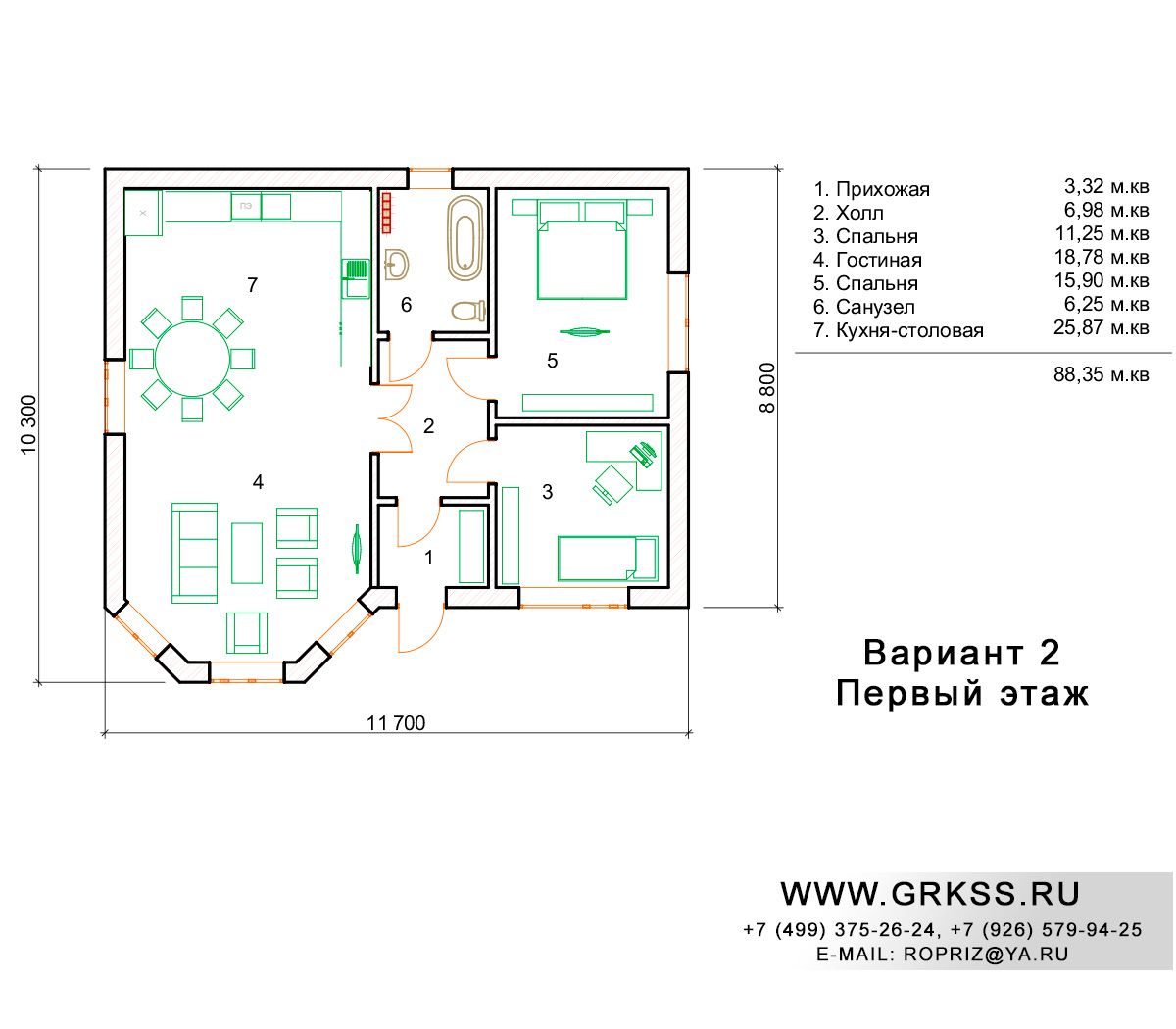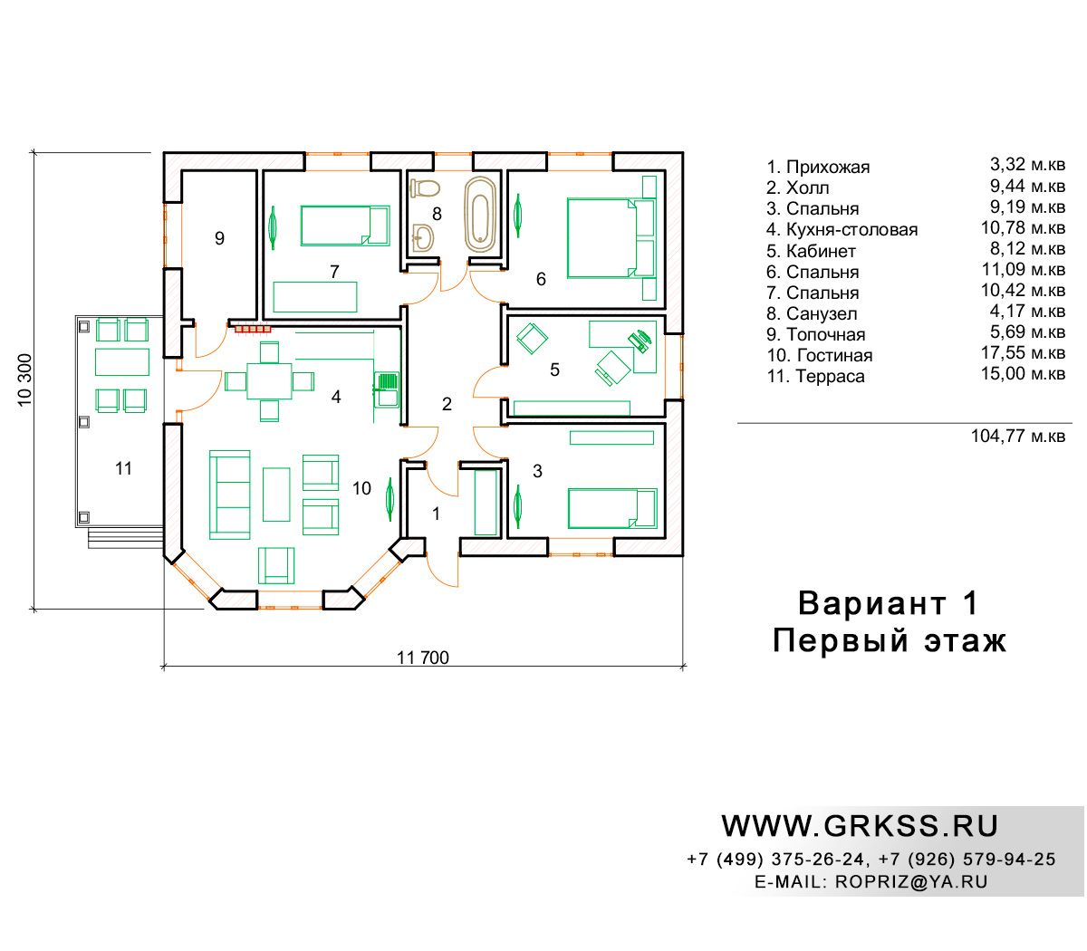 Представленный дом имеет базовые размеры 10,3 на 11,7 метра и общую площадь 104,77 метра квадратных. Качественные материалы, возможность их комбинирования, варианты изменения планировки и площади, а так же другие вопросы организации Вашего будущего дома, мы готовы обсудить с Вами в любое удобное для Вас время.