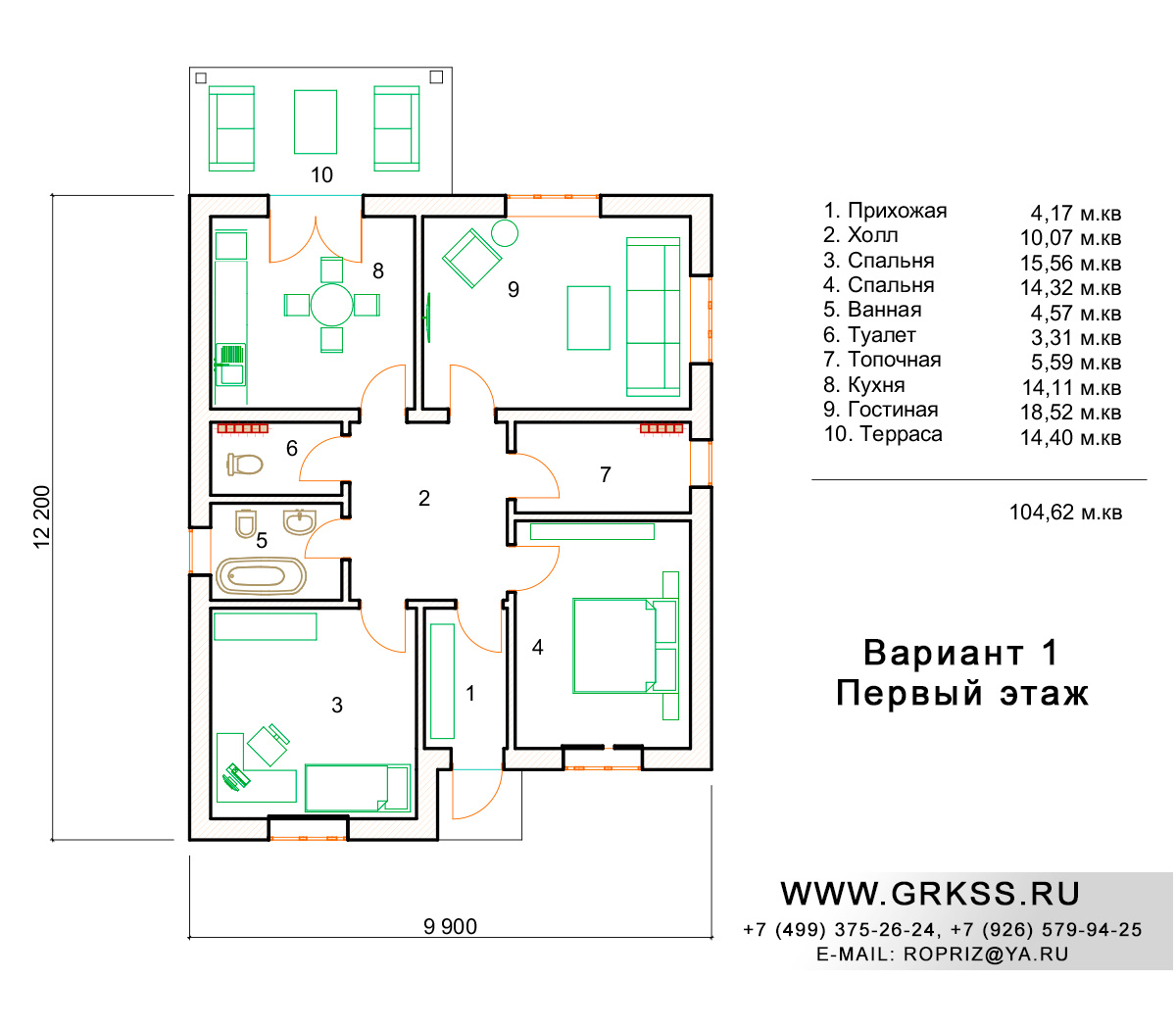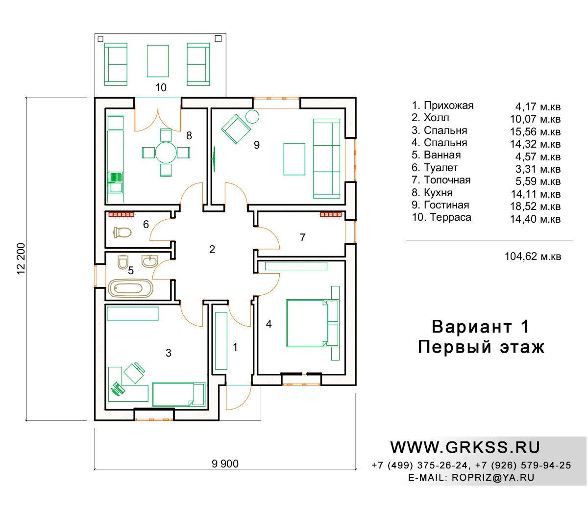 Проект одноэтажного дома с условным названием "Бромелия". Представленный проект имеет размеры стен 12,2 м. на 9,9 м. соответственно. Данным проектом предусмотрена изолированная кухня, так же возможно устройство террасы, выход на которую организован из кухни. Изолированное помещение под номером 9, в данном проекте исполнено как гостиная, но в зависимости от условий может использоваться как спальня. Относительно небольшой по размерам дом "Бромелия" станет прекрасной альтернативой проживания в квартире.