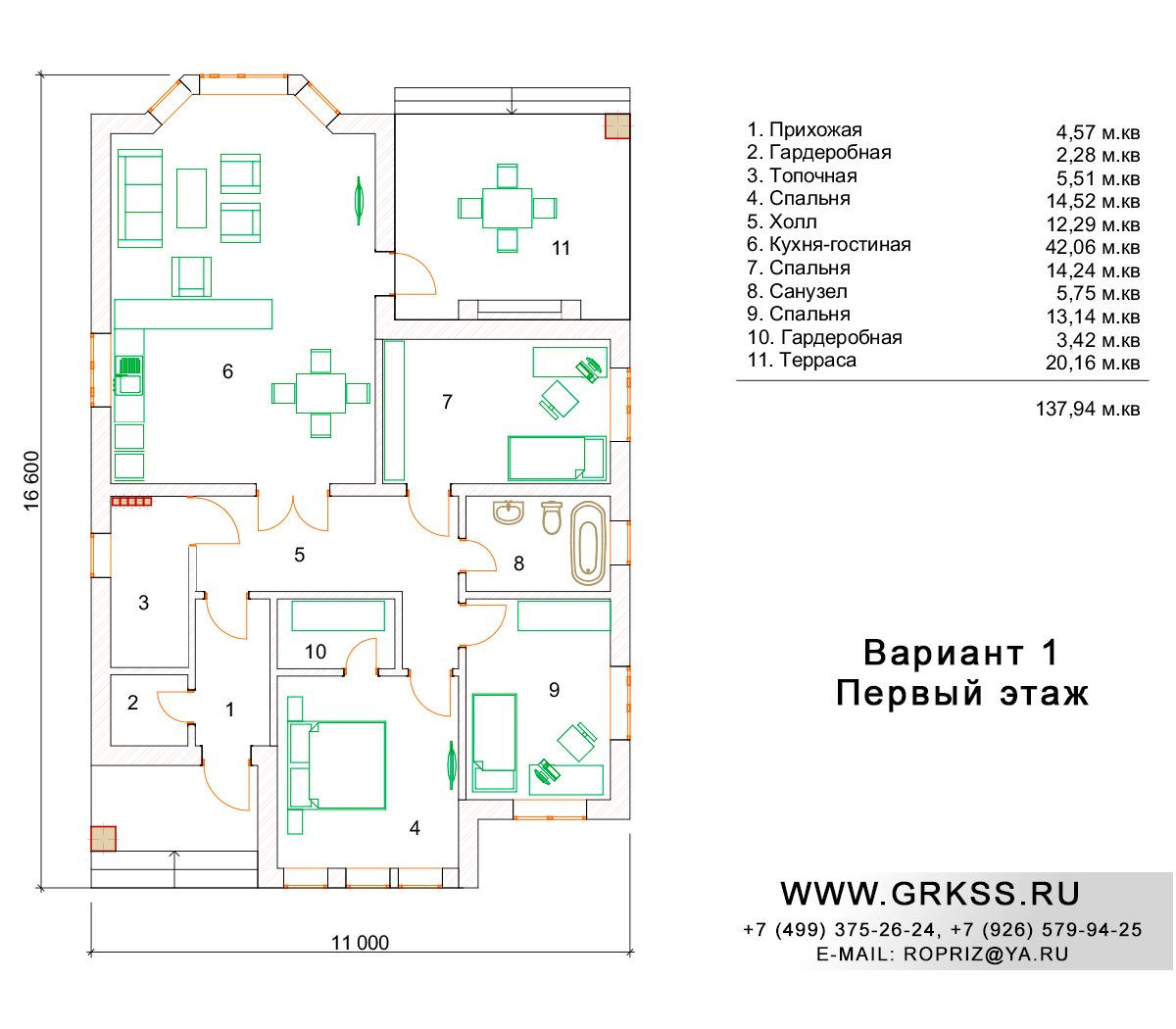 Проект одноэтажного дома с условным названием "Ландыш". Просторный одноэтажный дом, общей площадью 137 метров квадратных, включающий в себя три спальных комнаты, две комнаты для хранения каких либо вещей и одежды, большую по размеру кухню-гостиную. В проекте так же присутствует внушительных размеров 4 на 5 метров терраса. Варианты отделки, цветовые решения, а так же материалы из которых мы готовы построить Вам дом, можно обсудить отдельно.