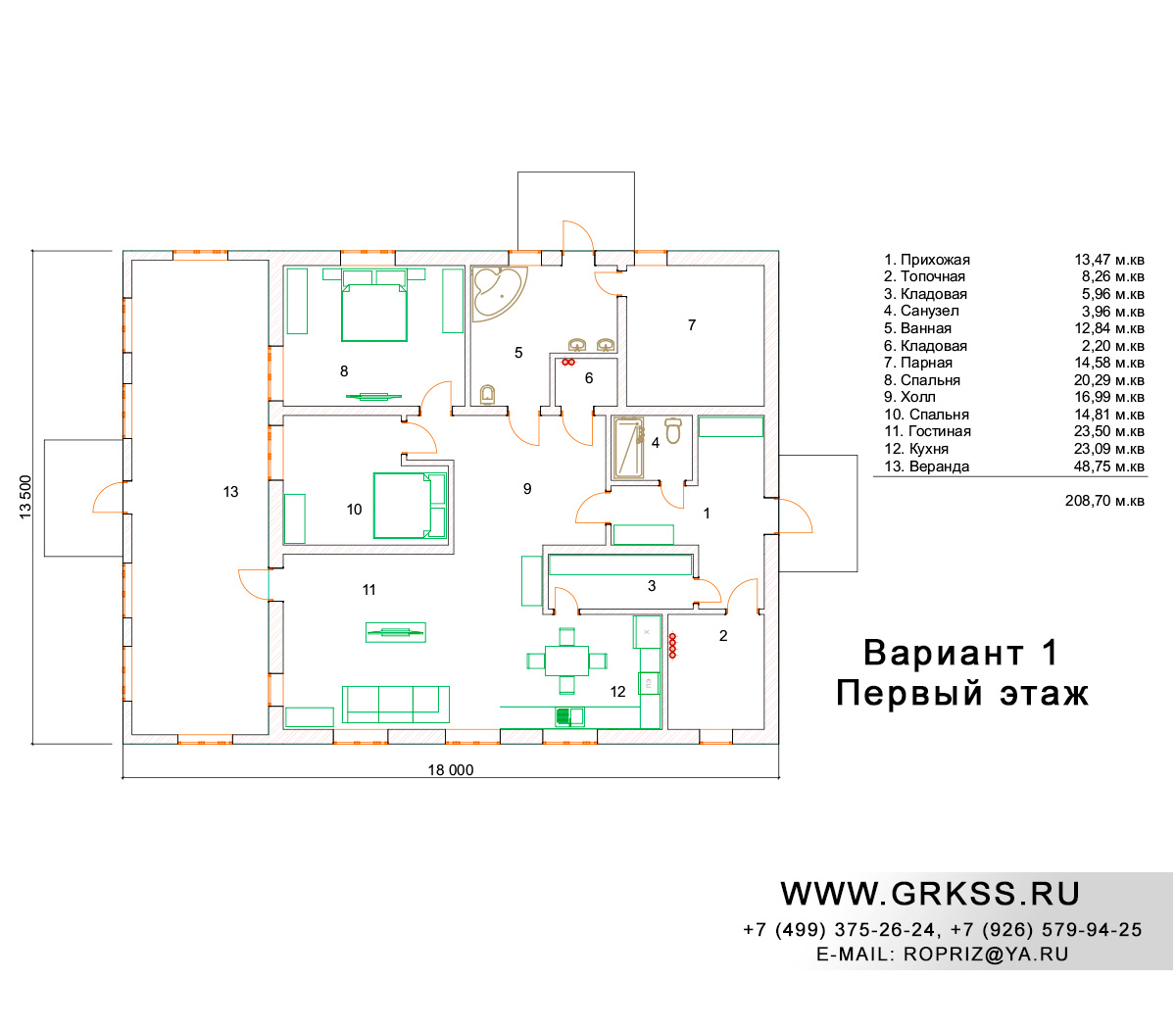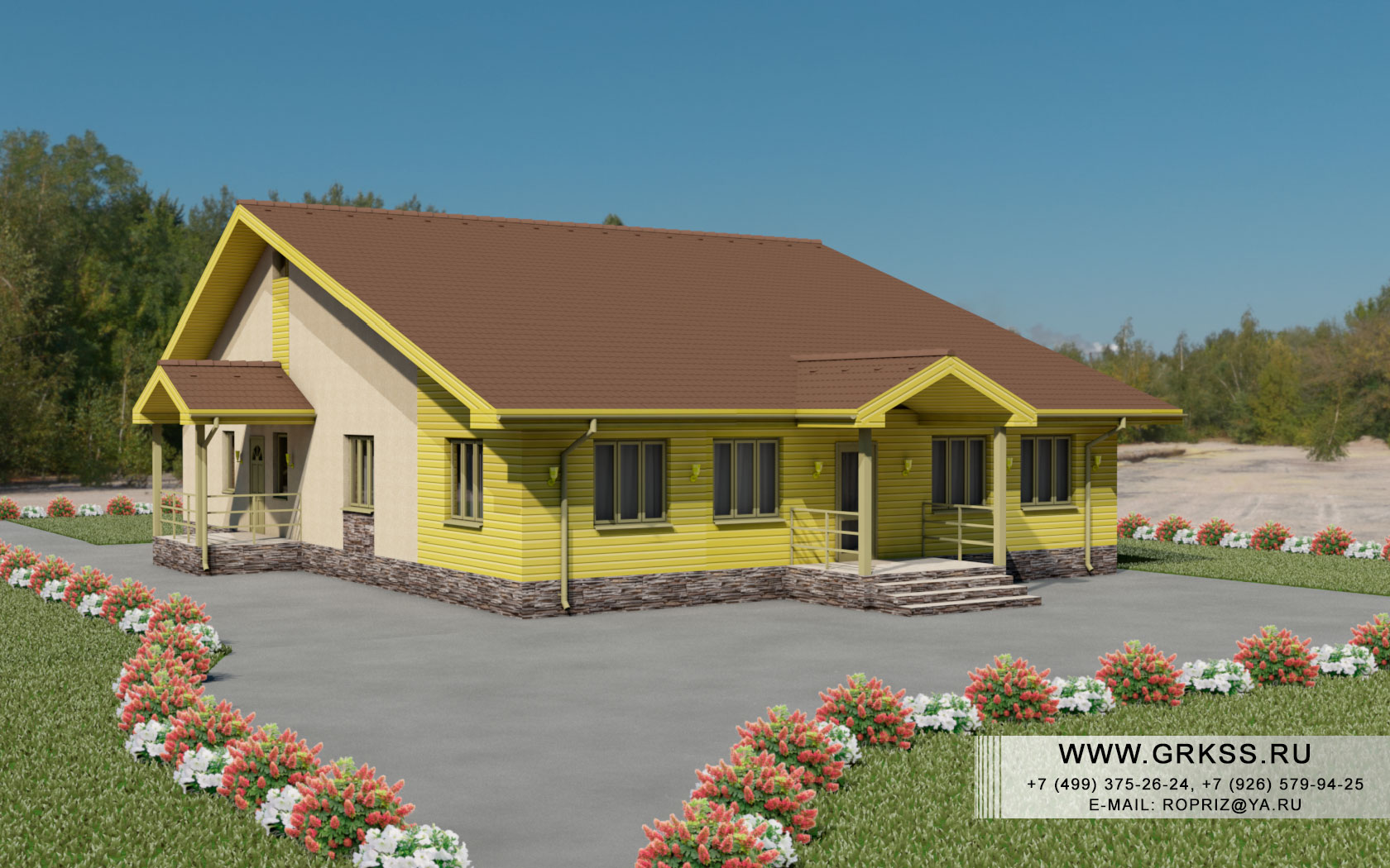 Проект одно этажного дома с условным названием "Крепкий". Красивый и большой одноэтажный дом, с великолепной верандой и террасой и все это великолепие под одной массивной крышей. Совмещенные между собой кухня и гостиная, помимо циклопических размеров, в добавок ко всему спроектированы со "вторым светом". На поэтажном плане дома можно увидеть помещение отведенное под баню, площадью почти 15 квадратных метров. При этом в проекте предусмотрены кладовка и болерная. Представленный вариант проекта включил в себя всего две спальни, но при желании планировку данного дома можно спроектировать на 3 и даже 4 спальни в зависимости от пожеланий. Данный проект великолепно впишется в архитектуру любого коттеджного поселка, станет местным украшением при его возведении в городской черте или в деревне. В данном проекте расположение комнат и проходы к ним приведены как пример, для восприятия и визуализации возможных вариантов устройства планировки.
