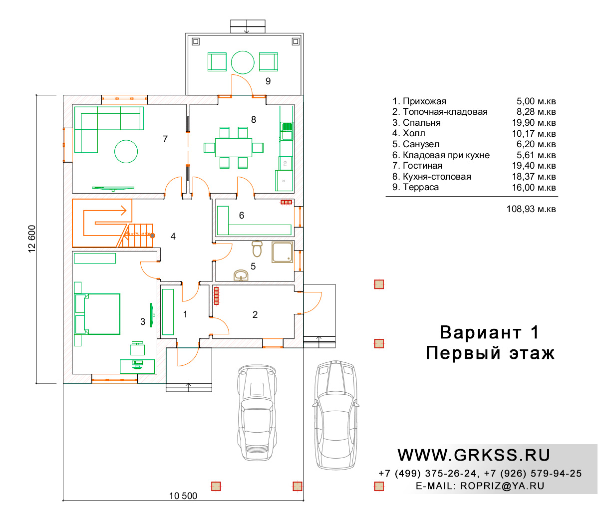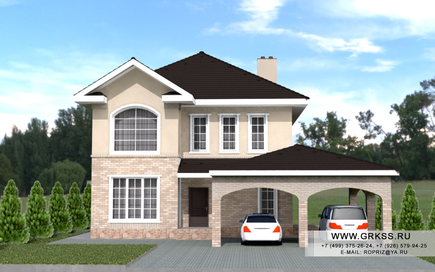 Проект двух этажного дома с условным названием "Грация". Общая площадь дома - 200 квадратных метров. В проекте навес на две машины, небольшое крыльцо перед входом в дом, просторная кухня на 18 метров квадратных, выход на террасу и пять спален. Просторный дом, удовлетворит запросы большой семьи в комфортном, индивидуальном проживании под одной большой крышей, данного дома.