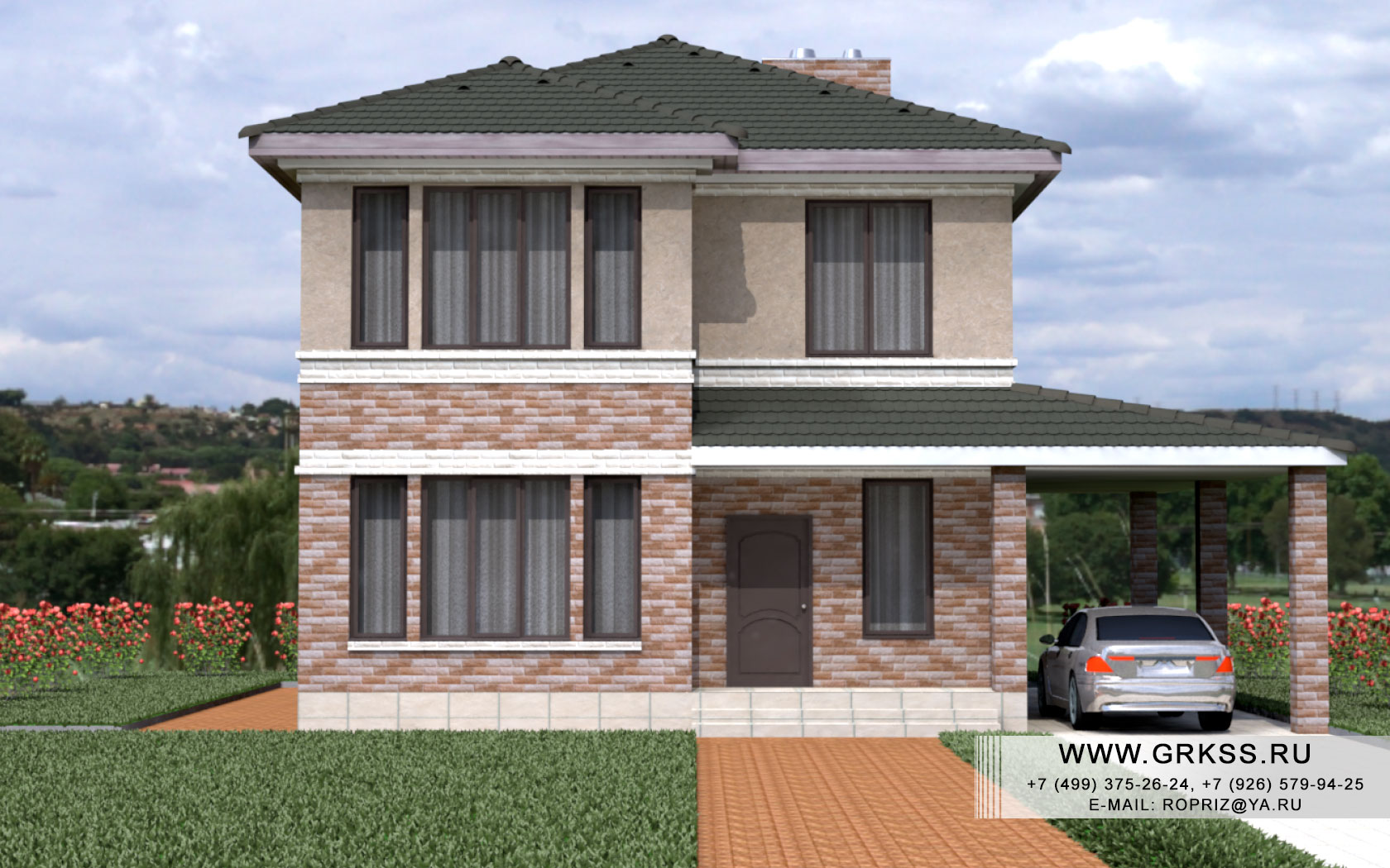 Проект двух этажного дома с условным названием "Кронос". Двух этажный дом с четырьмя спальнями, террасой и вариантом устройства крыши под навес, для парковки автомобиля. Относительно не большой по площади дом, с панорамными окнами фасада может стать великолепным украшением Вашего земельного участка.