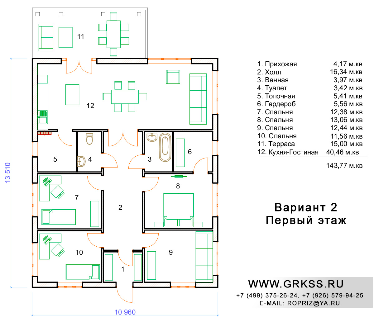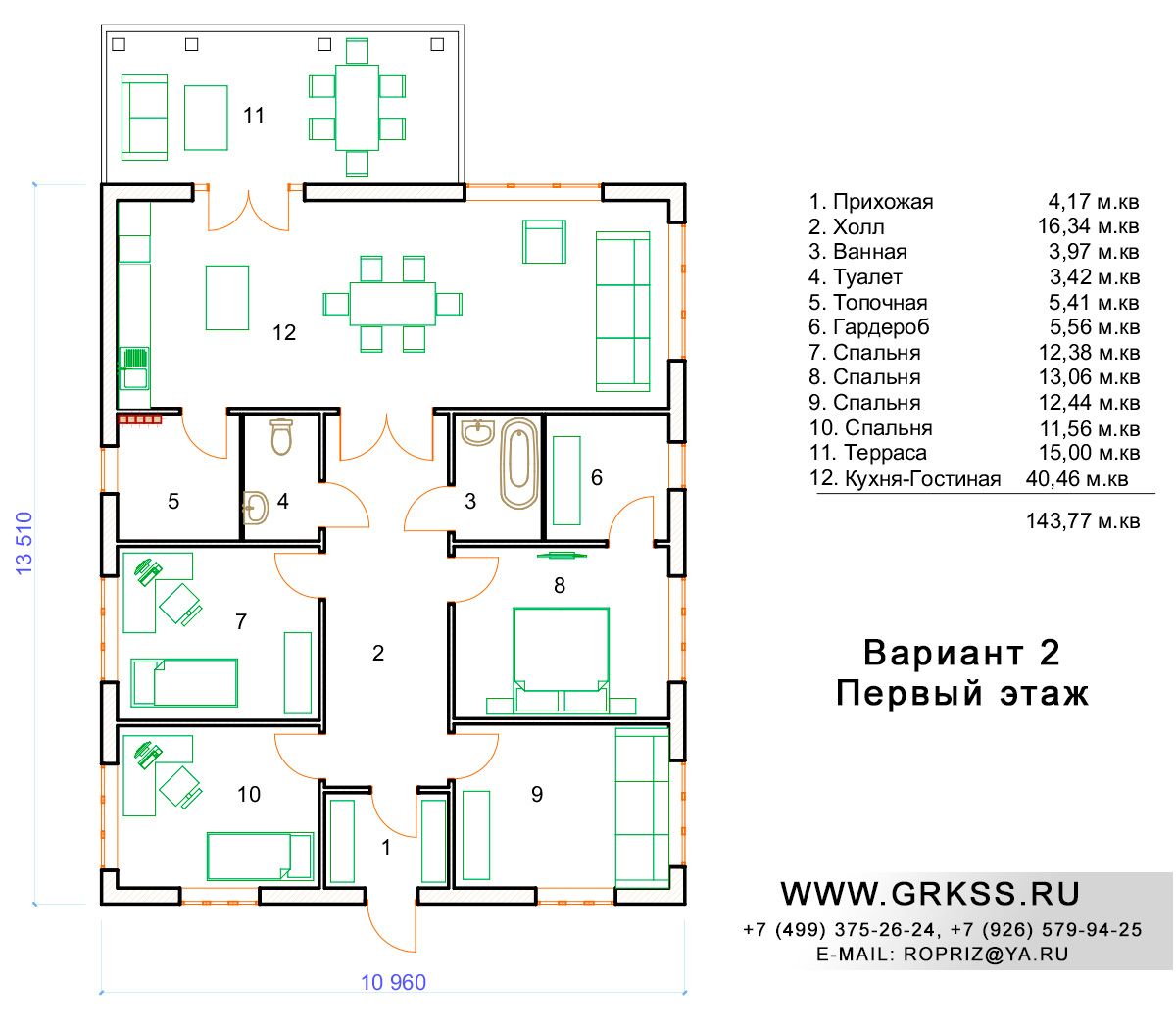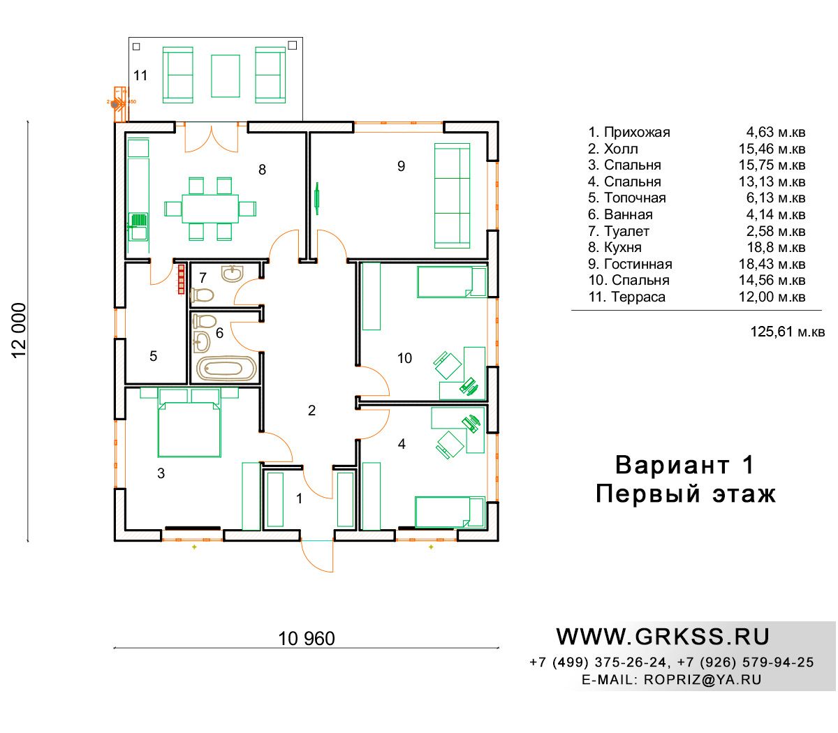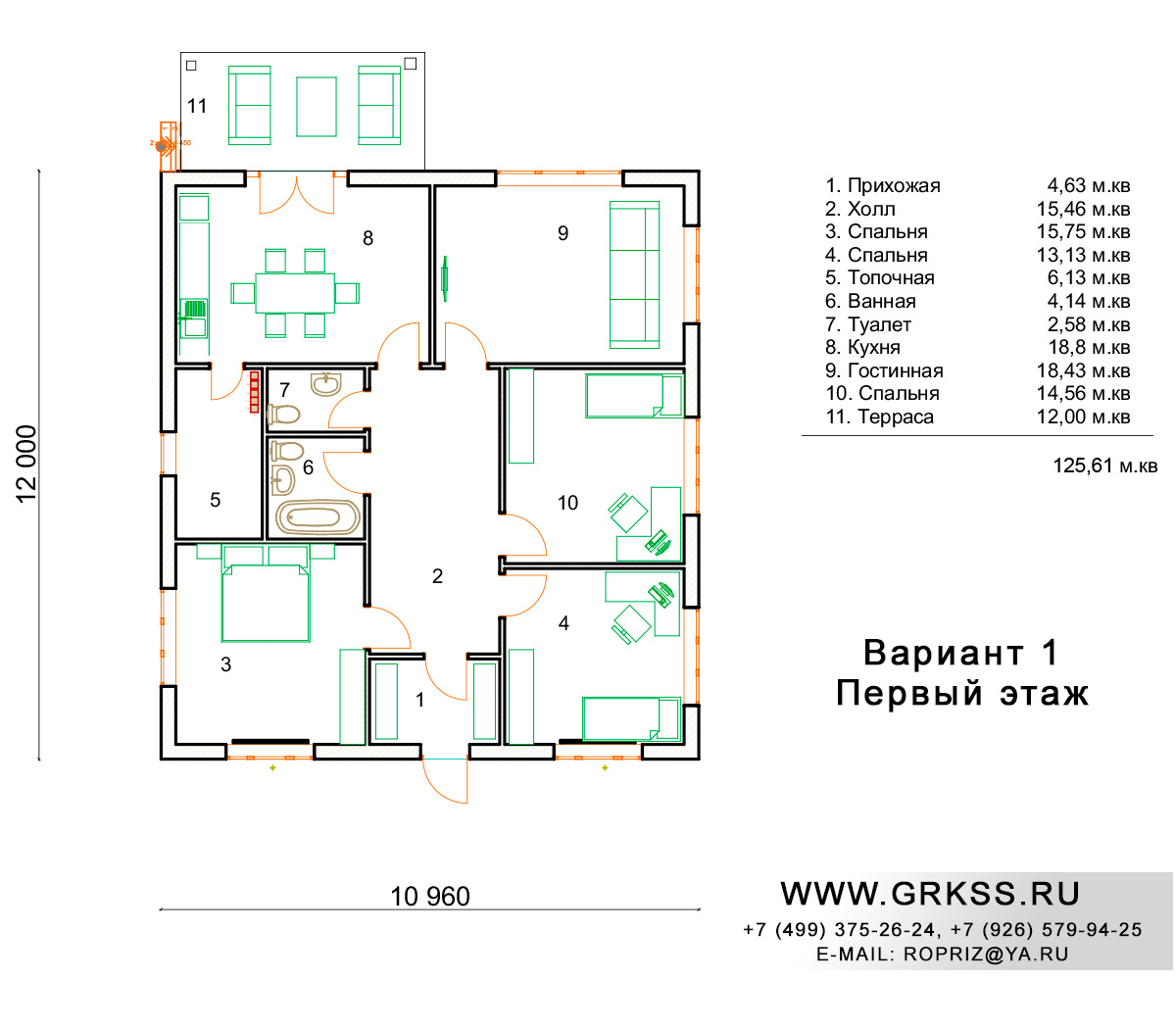 Предлагаемый дом общей площадью 125, 61 метра квадратных, представляет собой надежный, не дорогой образец одноэтажного дома с тремя просторными спальнями, отдельной кухней и отдельной гостиной. За счет небольшого увеличения размера одной из стен представленного дома, и совмещения площади кухни и гостиной, проект преобрел двойствоенность. Ко вниманию предложенно две вариации данного проекта. В проекте предусмотрено использование камня при возведении стен и их отделки. Этот проект, как и любой другой проект мы готовы обсудить с Вами индивидуально. Варианты расположения, размеры имеющихся в проекте помещений, высота стен и кровельных материалов, все это предмет отдельного обсуждения и переговоров.