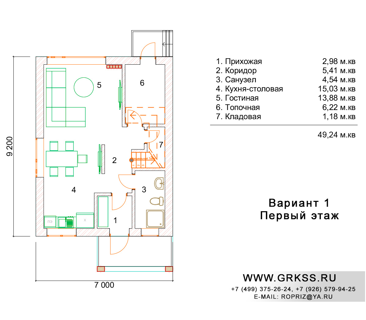 Предлагемый проект, представляет собой весьма небольшой, компактный, но в то же время функциональный во всех отношениях, полноценный дом, удовлетворяющий всем требованиям частного домовладения. Проект имеет общую площадь равную 101, 62 метра квадратных при размере пятна застройки с длинной стен 9,2 х 7 метров.