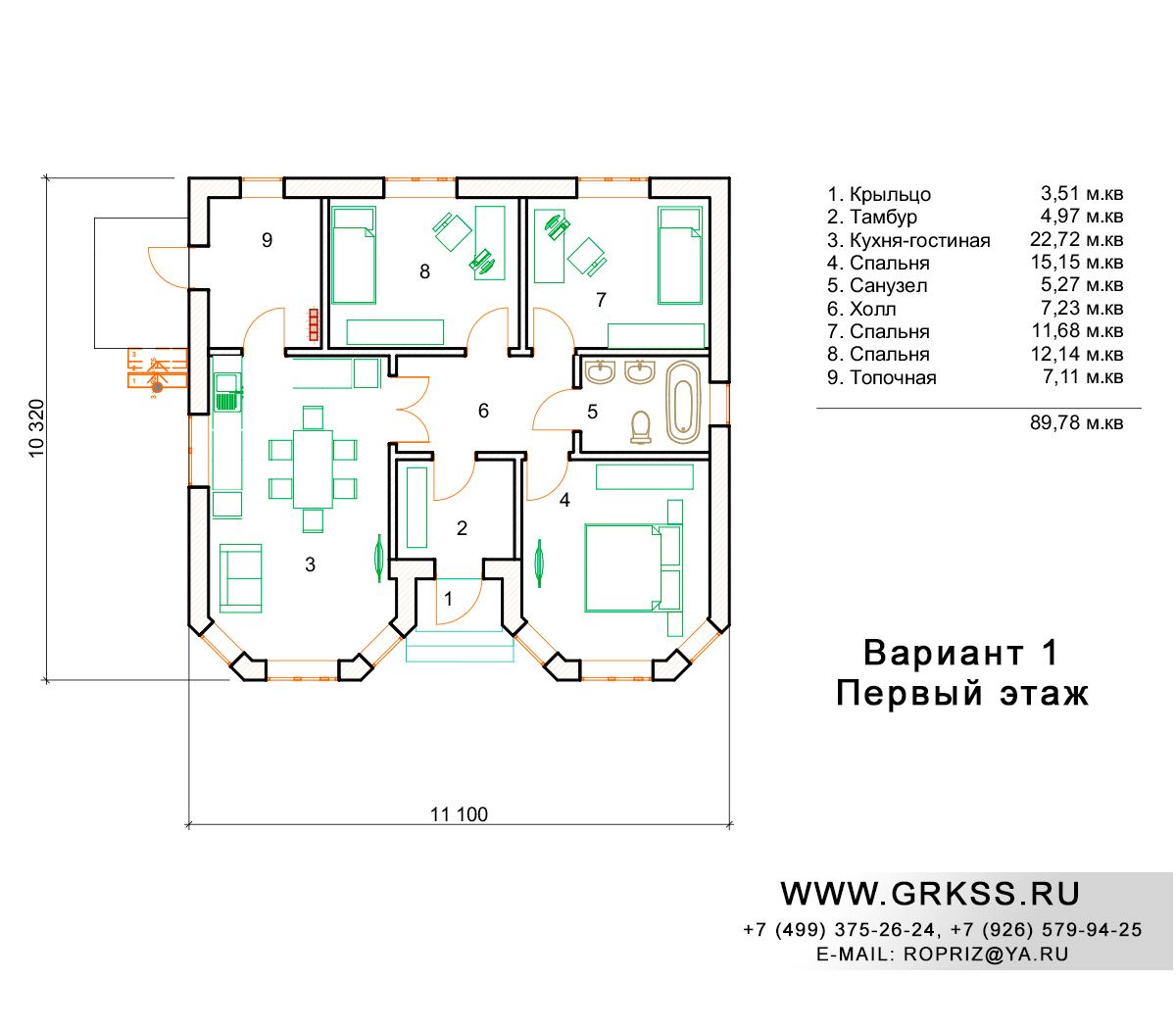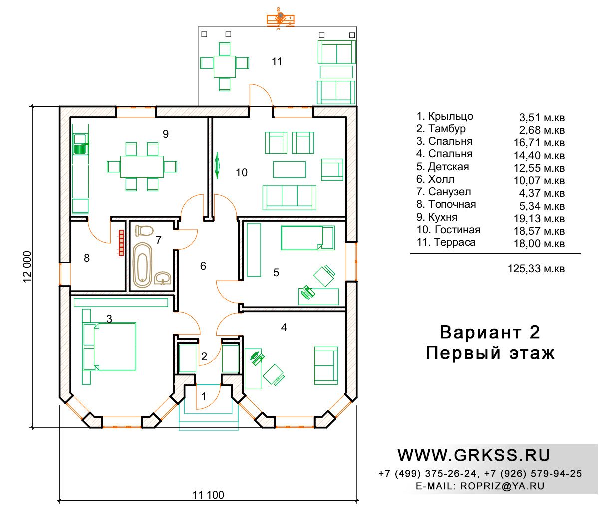 Проект одноэтажного дома "Эгоист", представлен в двух вариантах. Общая площадь дома в зависимости от задач и условий Заказчика варьируется от 89,7 метров до 125, 33 метров квадратных. Данный проект имеет три спальных комнаты, в следствии чего подойдет для круглогодичного проживания семьи из трех, четырех человек. Дом имеет два эркера, что в свою очередь выделяет данный дом на фоне других одноэтажных домов.